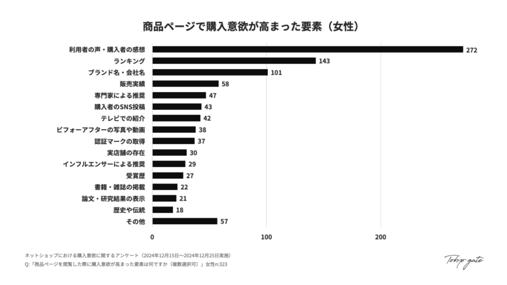 本調査を通じて、消費者が商品ページ閲覧時に購入意欲を高める要素や、性別による購買行動の違いが明らかになりました。