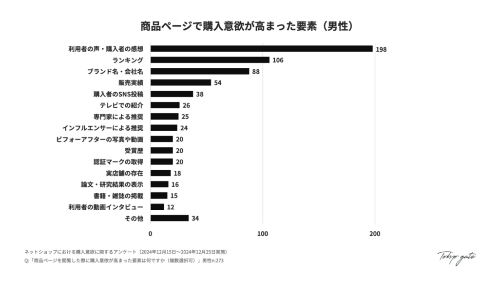 商品ページ閲覧時に購入意欲が高まる要素について、男性のデータを集計した結果、「利用者の声」「ランキング」「ブランド」などの要素は、男女ともに重視されていることがわかりました。