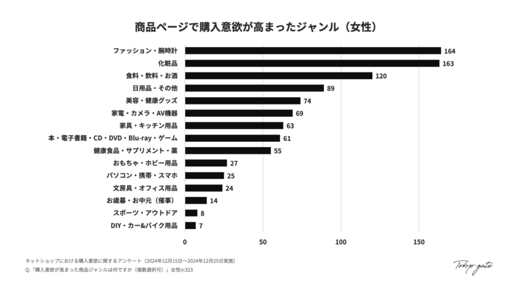 1. 女性ユーザーの2人に1人が、「ファッション」「化粧品」の購入に際し、商品ページで購入意欲が高まったと回答しています。
