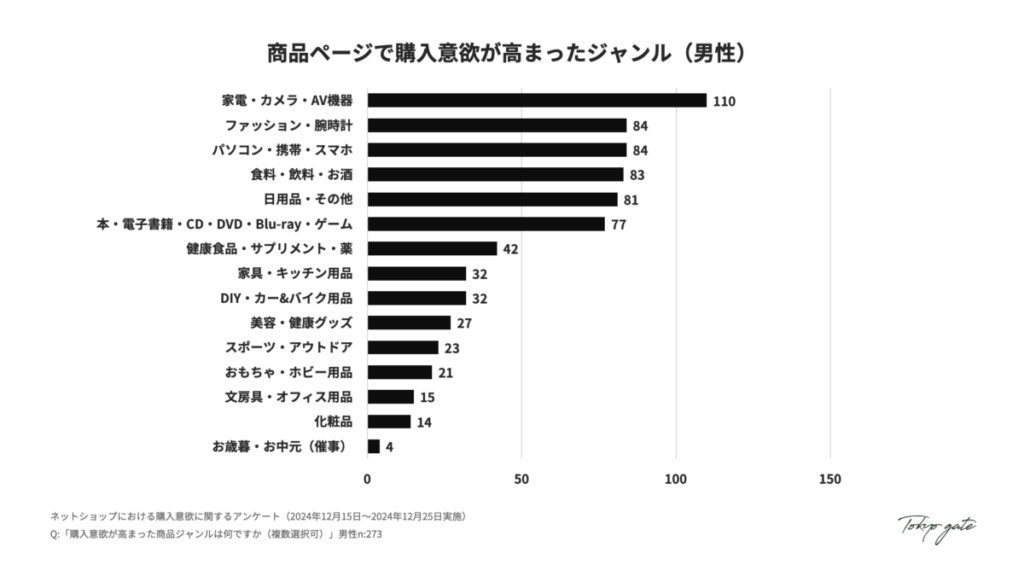 商品ページ閲覧時に購入意欲が高まった商品ジャンルについて、男性のデータを集計した結果、「家電・カメラ・AV機器」が上位にランクインし、約40%の男性が商品ページの影響を受けていることが明らかになりました。このジャンルは、男性にとってファッションよりも関心が高い可能性があり、性能や価格を客観的に比較しやすいため、購入検討が容易であると考えられます。