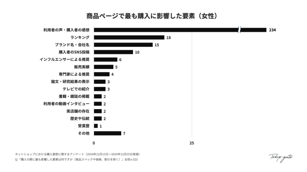 一方で、「インフルエンサーによる推奨」や「テレビでの紹介」が単独で購入の決め手となるケースは少なく、補助的な要素として機能していることが示唆されます。これらの要素は、直接的な購買行動よりも、商品ページへの集客や認知度向上に貢献していると考えられます。