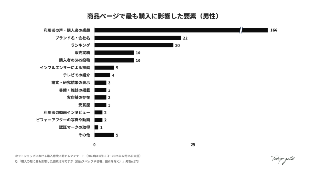 1. 「利用者の声」は、男女を問わず、オンラインショップでの購入決定に最も影響を与える要素であると言えます。