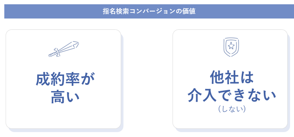 指名検索を行うユーザーは、すでに自社ブランドへの興味・関心が高い状態です。そのため、他の広告流入と比べて成約率(問い合わせ後の契約や購入率)が高いケースが多くみられます。