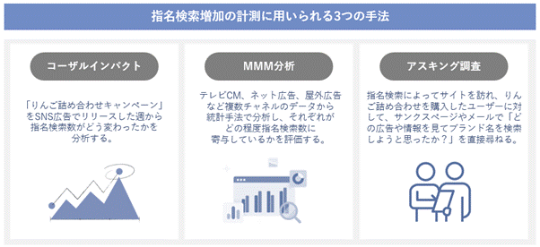 上記の難しさを少しでも解消するため、よく用いられるアプローチに、コーザルインパクトMMM分析、そしてアスキング調査があります。ここでは、SNS広告を活用して指名検索数を増やそうとしている地方農家のりんごECサイトを例に、解説します。