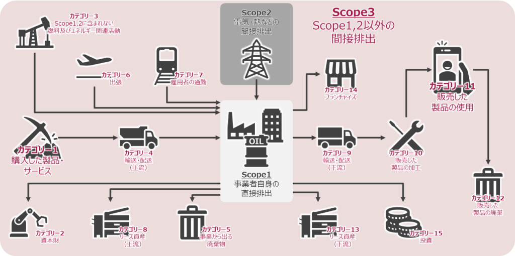 これは、事業者のサステナビリティにおける重要な部分である「企業活動におけるCO2排出量」の開示において、事業者が「自社のエネルギー利用に伴うCO2排出量(Scope1,2)」のみならず、バリュー・チェーン全体のCO2排出量についても責任を負う必要があることを示しています。