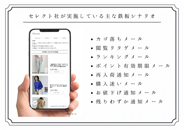 西北さん:アクションリンクというCRMツールを利用していて、これを通じてお客様それぞれに合うメッセージ配信を行っています。具体的にはカゴ落ちメールやお値下げ通知メール、残りわずか通知メールなど8パターンほどのシナリオを活用し自動配信。日々の売上が底上げされている印象です。