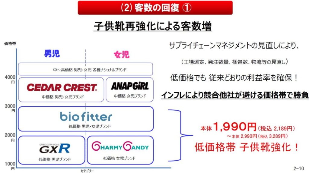 低価格モデル(税抜1,990円~)から、耐久性や機能性を備えた中価格帯商品(「ガチ強」「Biofitter」など)まで価格帯別に強化を進め、サプライチェーンの見直しにより利益率の維持にも配慮。2025年2月期には子供靴カテゴリー全体で100万足の販売を目指しました。さらに、戦略的ブランド「CHARMY CANDY」やアサヒシューズとの協業による機能性商品も展開されています。