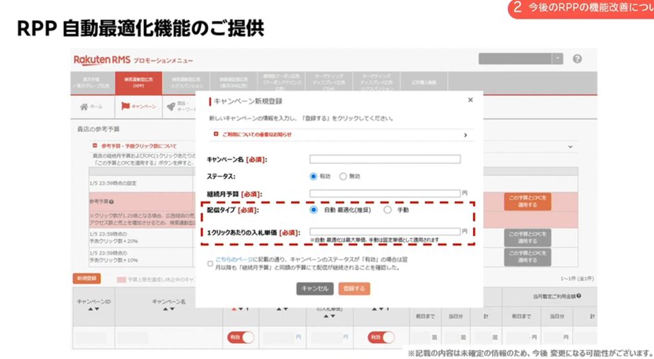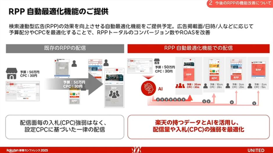 この機能は、楽天の保有する購買データとAI技術を活用し、広告配信先ごとにCPCや配信量を最適化するというものです。従来のRPP広告では、CPCや予算が全ての広告掲載面へ共通設定されていましたが、今後は配信先ごとに強弱をつけた調整が可能になります。