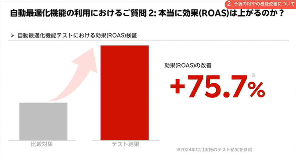 2024年12月に実施されたテスト運用では、ROASが+75.7%改善されたという報告があります。ただし、商材や金額の詳細は明かされておらず、楽天24など自社運営店舗の可能性もあるため、数値をそのまま鵜呑みにせず、自社でのテスト導入が推奨されます。