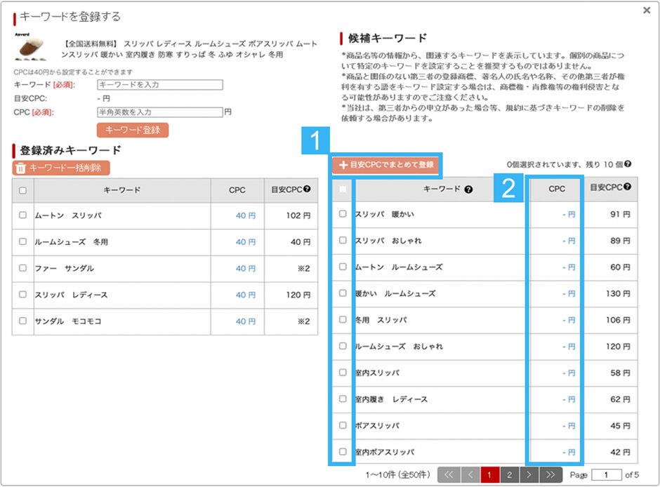 この機能は、RPP広告で商品にキーワードを設定する際、楽天の購買データや商品情報をもとに、最大50個のキーワード候補を自動で表示してくれるというものです。表示順は、検索頻度の高い順に並び、広告設定時のキーワード選定をサポートしてくれます。