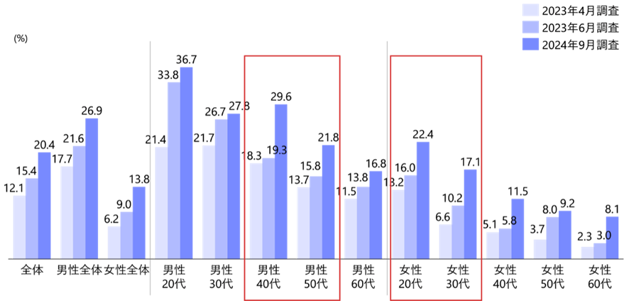 ChatGPTの年齢別利用率の調査でも、20代・40代が多く、30代が少ないです。中間層がAI導入に乗り遅れないよう、再スキル化が急務であるといえます。