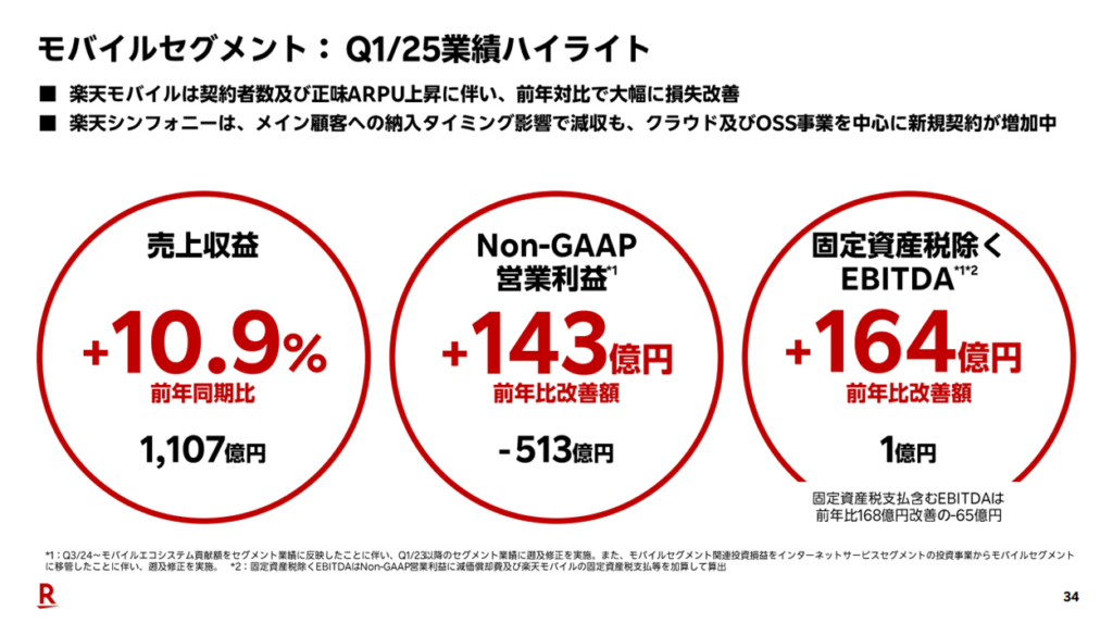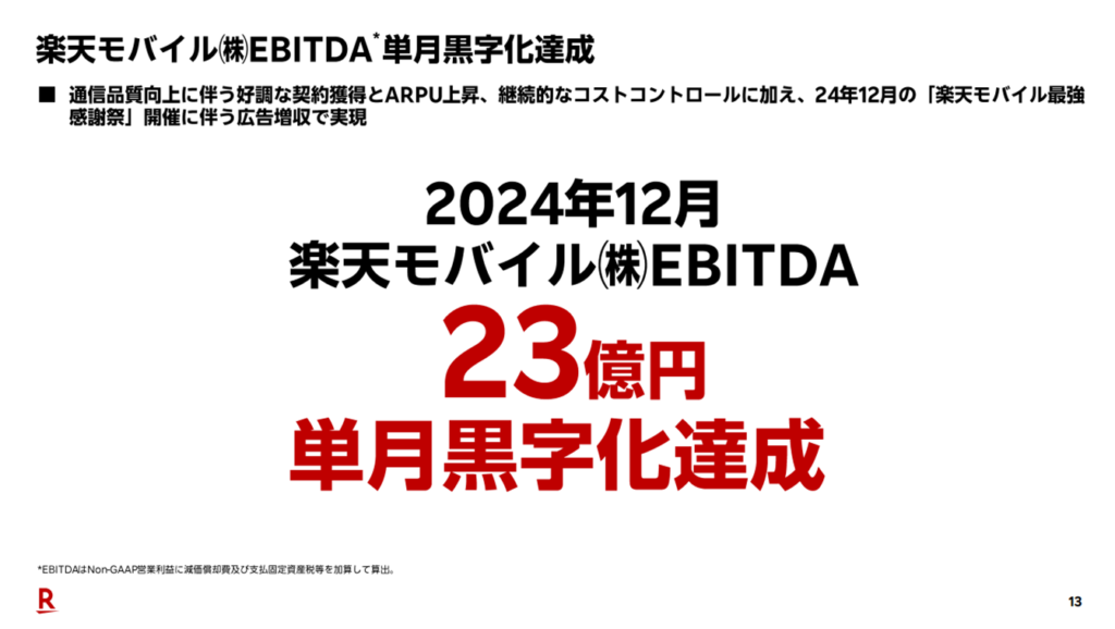 決算では、「固定資産税支払い含むEBITDA」が▲65億円であるにもかかわらず、調整後のEBITDAを黒字として開示するなど、利益構造の見せ方に工夫が見られました。このような調整は、楽天モバイルの経営改善が進んでいることをアピールしたい意図が感じられます。