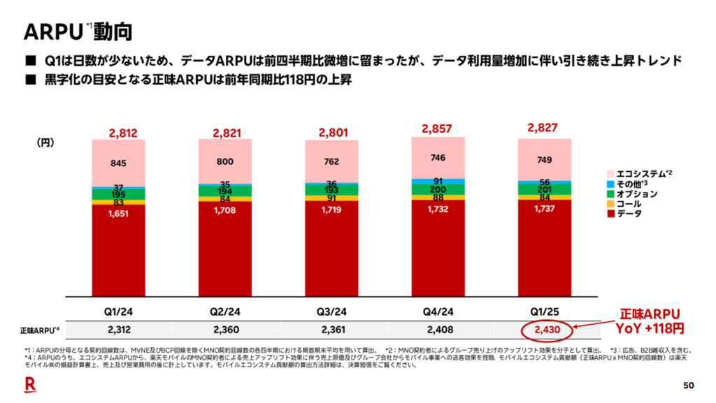 また、今回新たに「正味ARPU(Average Revenue Per User)」という指標が登場しました。これはエコシステムによる間接的な収益を除外した実質的なARPUを示しています。正味ARPUは2,430円となり、前回の2,408円から22円上昇、前年比では+118円の改善となりました。一方で、従来のARPUは2,827円と、前回より30円減少しています。