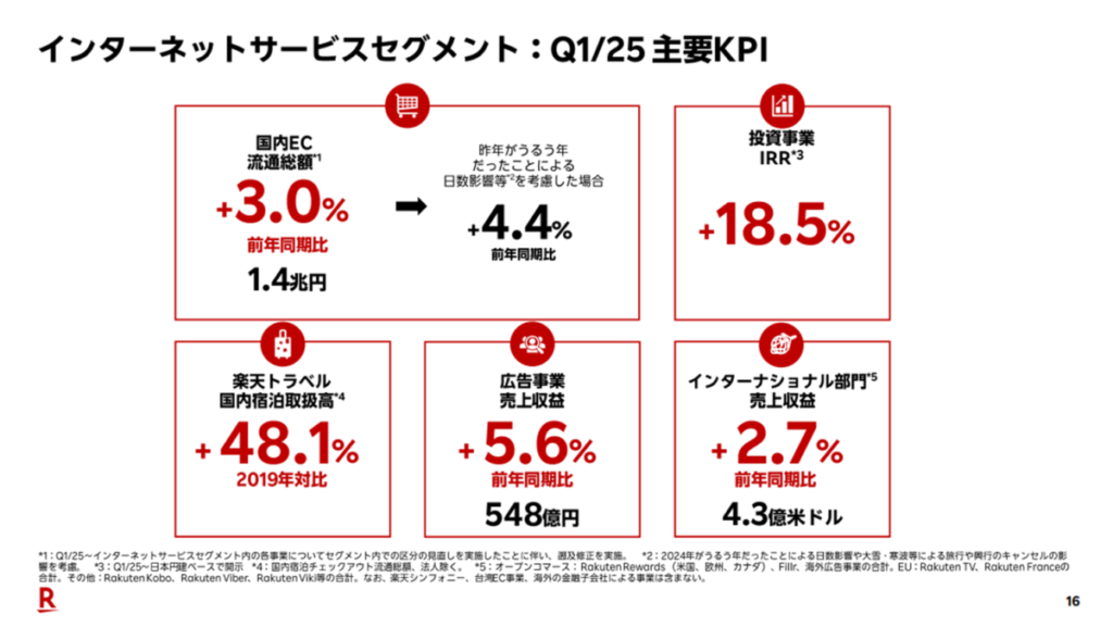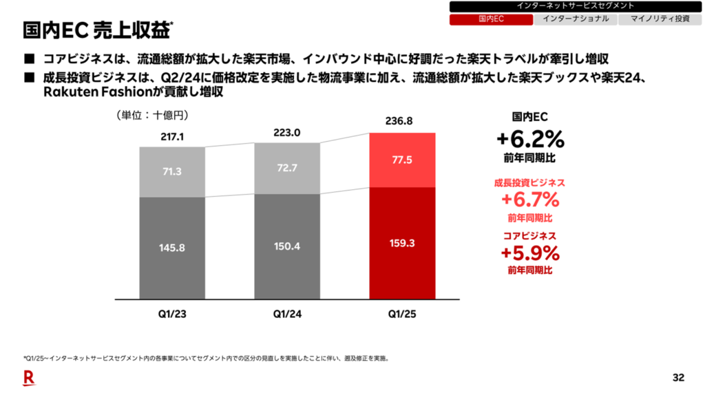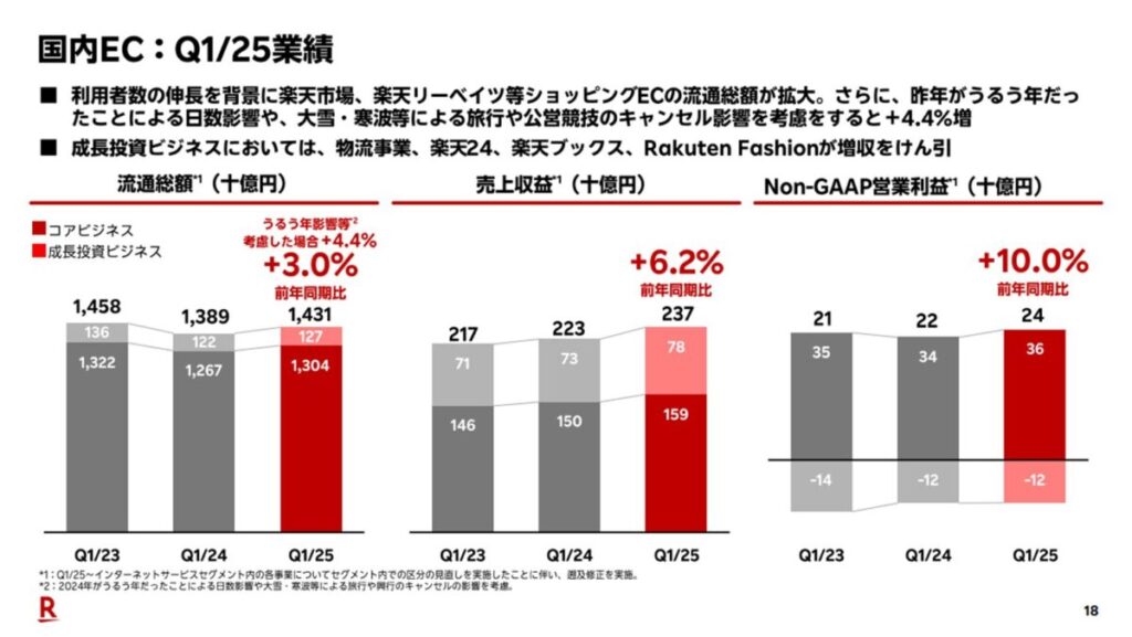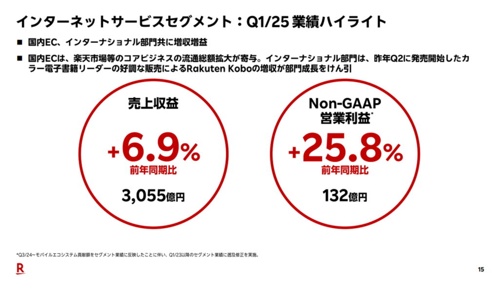 2025年Q1の売上収益は3,055億円(前年比+6.9%)、Non-GAAP営業利益は132億円(前年比+25.8%)となり、収益面では好調に推移しています。楽天市場、楽天トラベル、楽天ブックス、ラクマ、楽天GORAなどの複合的なサービスが支えとなっています。