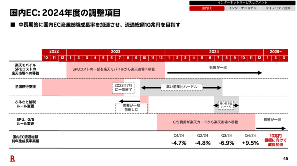 楽天グループはかねてより、2030年までに国内EC流通総額10兆円を達成するという中期目標を掲げてきました。しかし、2024年の通期決算時点ではその期日表記が消え、「中期的に目指す」という表現に変更されています。