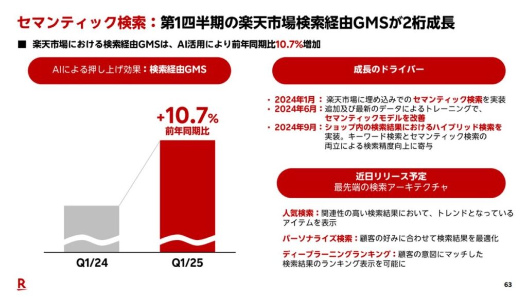 AIによる「セマンティック検索」の導入により、検索意図をくみ取った精度の高いレコメンドが実現し、検索経由GMS(流通額)は前年比+10.7%と大きく成長しました。