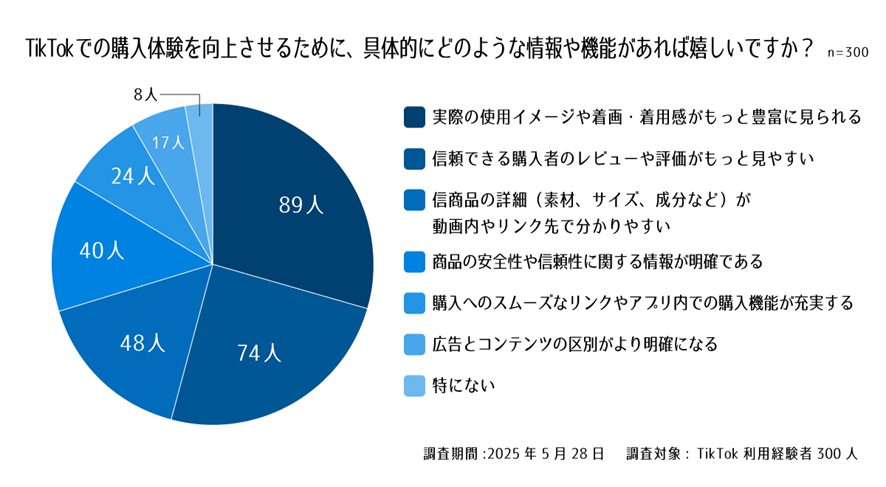 TikTokで商品を購入する際に、ユーザーが「実際の使用イメージや着画・着用感がもっと豊富に見られる」ことを最も求めていることが明確になりました。また、「信頼できる購入者のレビューや評価がもっと見やすい」ことや、商品の詳細情報、安全性へのニーズも高いことがわかります。