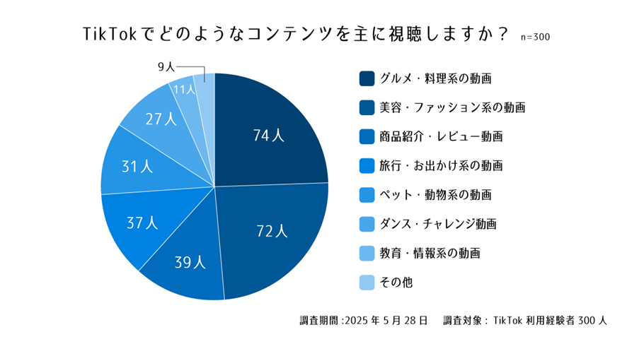 TikTokユーザーはグルメ・料理系と美容・ファッション系のコンテンツに高い関心を持っていることが明らかになりました。商品紹介・レビュー動画も一定のニーズがありますが、上位カテゴリと比較すると差があります。