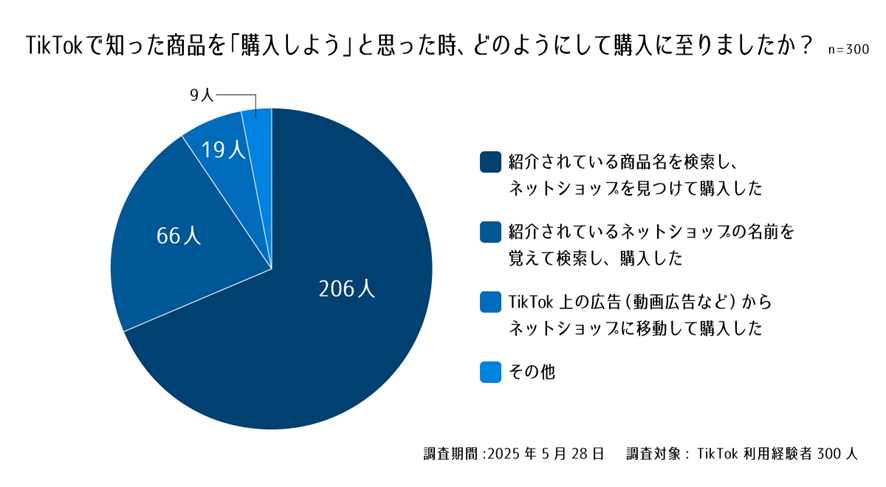 この結果から運営者にとって、TikTokでの商品紹介は、お客様が「商品名で検索する」ことを意識した戦略が重要だと言えます。動画内で商品名を明確に伝えたり、覚えやすい商品名にするなど、検索されやすい工夫を凝らすことで、TikTokからの購入に繋がりやすくなるでしょう。