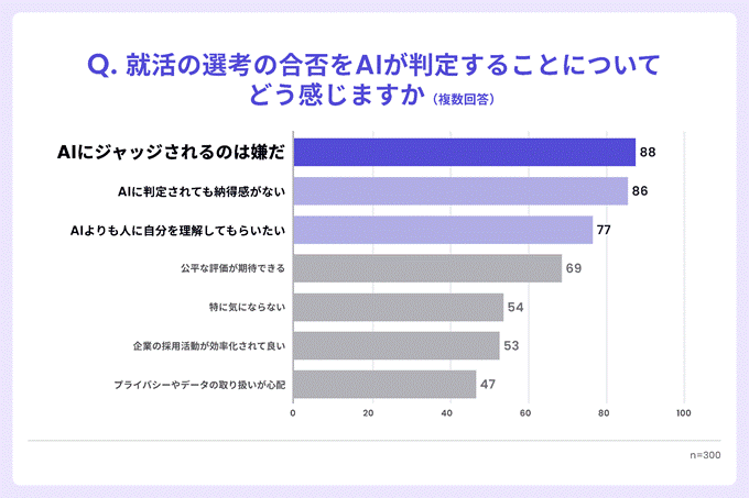 しかし興味深いのは、AIに対する信頼度です。「AIにジャッジされるのは嫌だ」(88人)、「AIに判定されても納得がない」(86人)という意見が最も多く、「AIよりも人に自分を理解してもらいたい」(77人)という声も目立ちました。