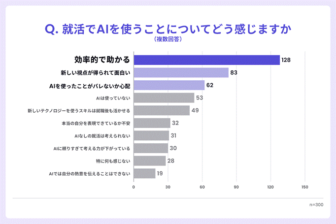 私たちの調査では、約6割の就活生が就活プロセスでAIを活用していることがわかりました。「効率的で助かる」(128人)、「新しい視点が得られて面白い」(83人)という評価が多く、Z世代がAIを有益なツールとして捉えていることがうかがえます。
