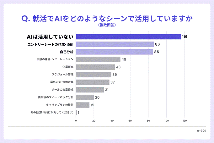 具体的な活用シーンとしては、「エントリーシートの作成・添削」(86人)と「自己分析」(85人)が上位を占めています。一方で、118人(3分の1以上)の就活生が「AIは活用していない」と回答しており、Z世代内でもAI活用には差があることがわかります。