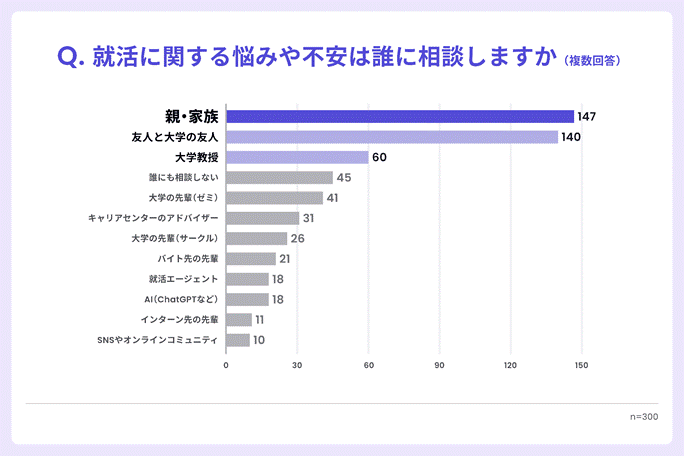 調査では、相談相手として「親・家族」(147人)、「友人と大学の友人」(140人)が圧倒的多数を占め、「AI(ChatGPTなど)」(18人)や「SNSやオンラインコミュニティ」(10人)は少数派でした。