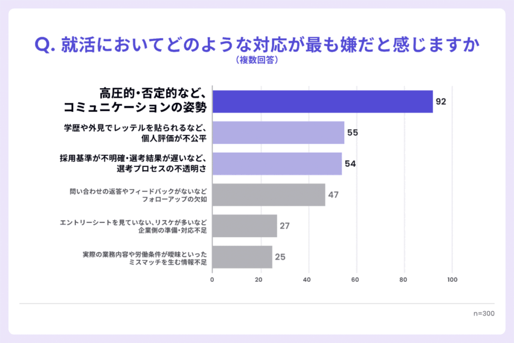 Z世代が企業に対して最も強く求めているのは、「人間らしい関わり」です。調査では、就活生が最も嫌だと感じる企業の対応として「高圧的・否定的など、コミュニケーションの姿勢」(92人)が圧倒的多数を占めました。