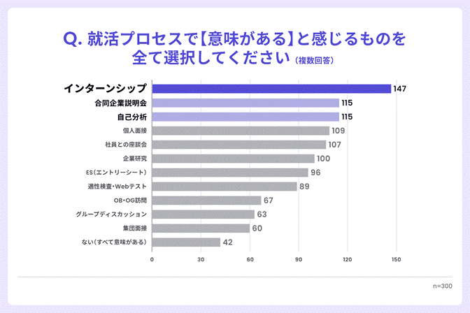 調査では、「すべての就活プロセスに意味がある」と答えた学生が110人と最多でした。特に「意味がある」と感じるプロセスとして、「インターンシップ」(147人)、「自己分析」(115人)、「企業説明会」(115人)が挙げられています。