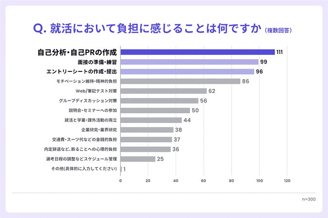 一方で、「自己分析・自己PRの作成」(111人)は負担に感じる要素としても最上位に挙がっています。つまり、「意味はあるけれど負担」という微妙な位置づけなのです。「面接の準備・練習」(99人)、「エントリーシートの作成・提出」(96人)も負担として上位に挙がっています。