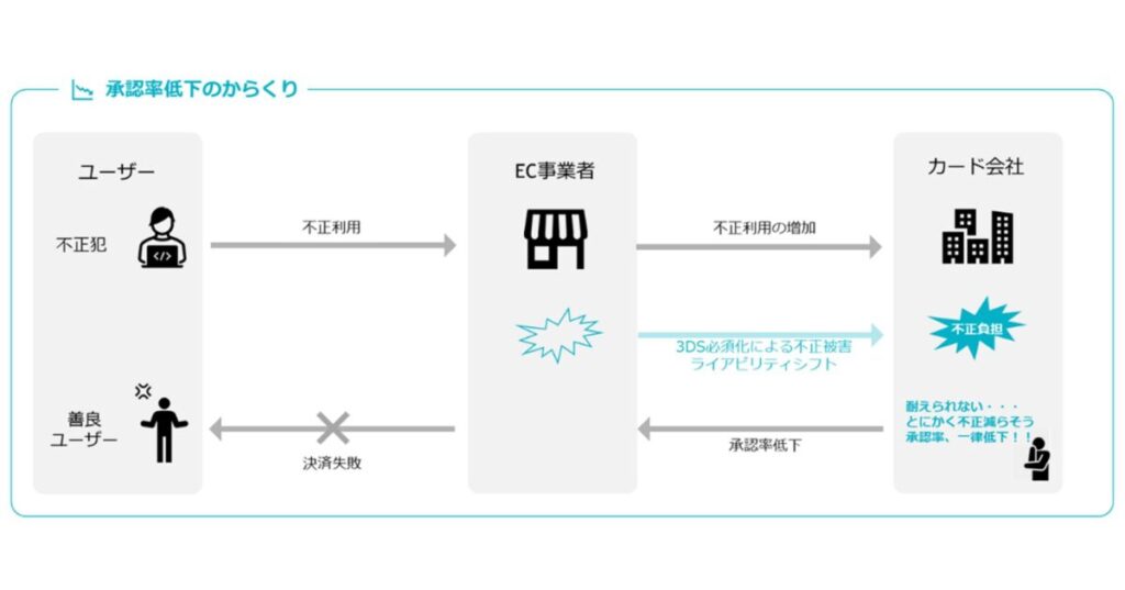 たとえば、不正利用を警戒してカード会社が慎重になりすぎた結果、問題のない取引まで拒否されてしまうケースもあります。EC事業者にとっては、ようやく購入意思を固めた顧客を、決済段階で失注させてしまう「見えづらい損失要因」となるため、軽視できない課題となっています。市場の拡大に伴い、EC事業者は「不正利用への対策強化」「承認率向上」「カート放棄(カゴ落ち)防止」など、相互に関連し合う課題に取り組む必要があります。