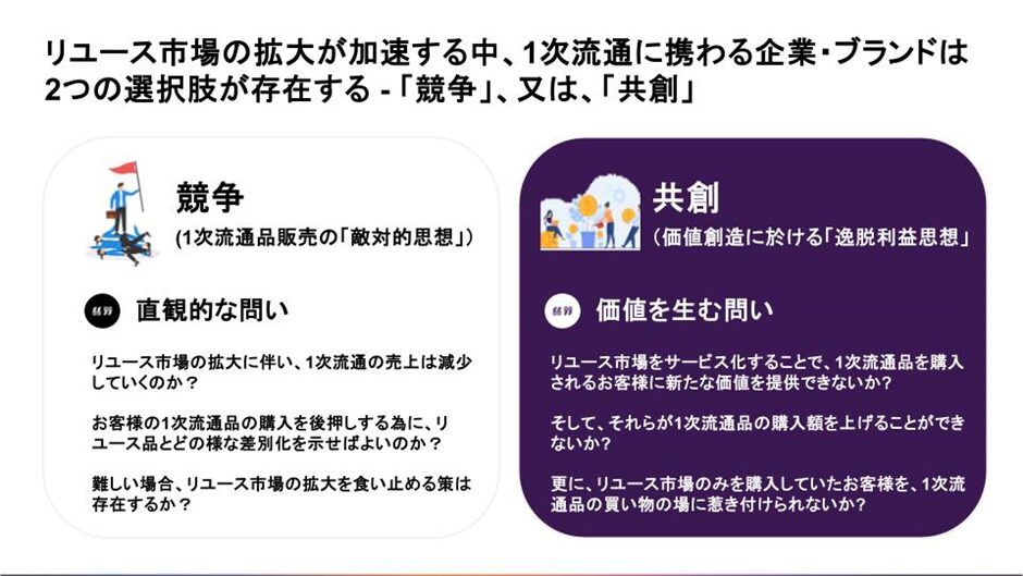前者の場合、ブランドが検討すべき問いは、いかに新品の売上低下を食い止め、新品とリユース品を差別化し、リユース市場の拡大と戦えるか、というものになります。新たな敵として戦う相手とみなす方向性です。