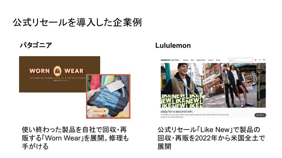 これらのサービスを活用することで、これまで自社だけではリセールに踏み込むことが難しかったブランドも、新たなリセール戦略を描くことができます。実際に、パタゴニアやLululemonなど一部のブランドは、上に挙げたResale-as-a-Service型のサービスを積極的に取り入れ、自社商品の公式リセールプログラムを購買体験の一部として取り入れています。こうした取り組みは、使用後の商品の流れを作り、消費者のリセールをサポートする仕組みを実現します。