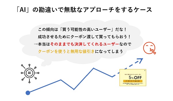 中原さん:具体的な施策例としては、配る必要のない無駄な値引きのクーポンを配布して結果的に利益を下げてしまったり、そのままでも決済してくれるはずのユーザーに響かない接客をしてしまったりすることで商品の購入を阻害してしまうようなことです。ある面ではマイナスの事態になりかねません。ただし、売上やCVRで結果が出やすい状態のユーザーをターゲットとしていることもあり、結果が良好であるかのように見えるので、事業者側としては表面的な結果に満足して気づきづらい状況になってしまいます。
