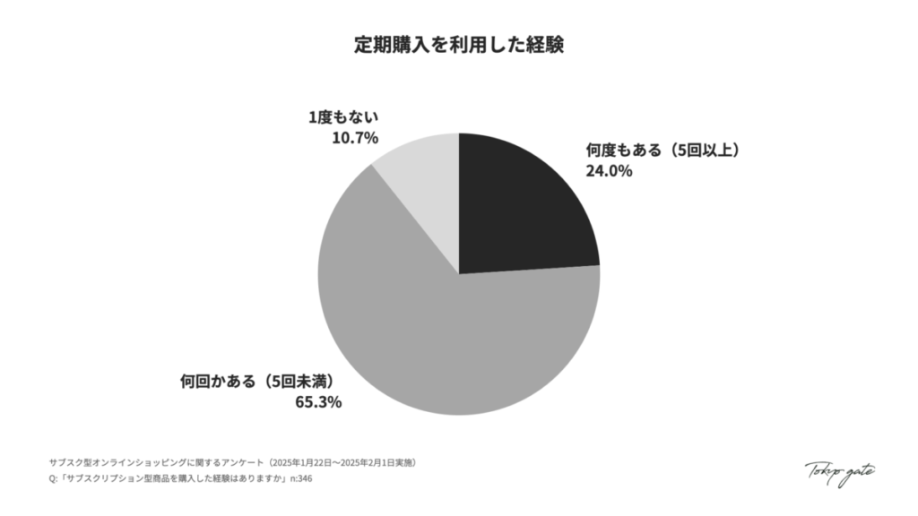 株式会社TOKYO GATEでは、2025年1月22日から2025年2月1日にかけて、オンラインショップで購入経験のある18-70歳の男女346人を対象に、サブスク型オンラインショッピングに関するアンケートを実施しました。