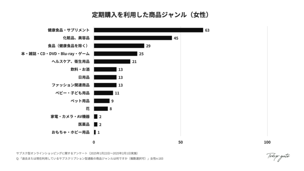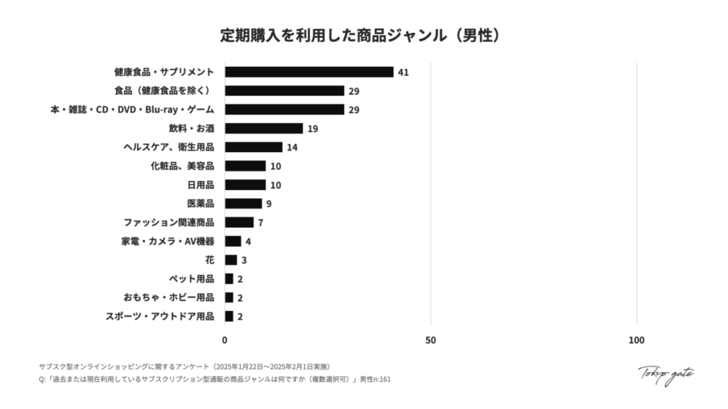- 健康食品・サプリメントは定期購入が利用される最多の商品カテゴリーで、次いで食品、本・ゲーム、化粧品・美容品が高い割合を示しました。