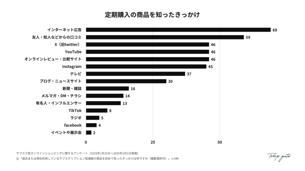 定期購入の商品を知ったきっかけについて調査した結果、インターネット広告が最多となり、次いで友人・知人などからの口コミ、X、YouTubeなどが続きました。この結果から、定期購入の認知経路は、口コミを除いて、オンライン起点が多数を占め、さまざまな媒体経由で認知されていることが明らかになりました。