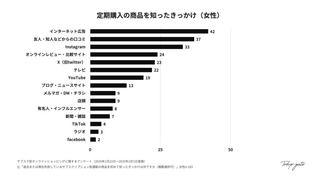女性による定期購入の認知経路について調査した結果、インターネット広告、友人・知人からの口コミが多数を占めるほか、Instagramが3番目に多い経路として挙げられ、男性と比較しても高い約18%を占めることがわかりました。