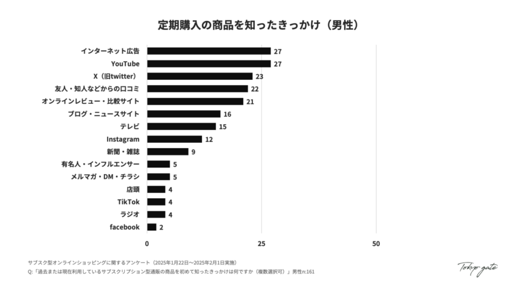 男性が定期購入の商品を認知する経路について調査した結果、最も割合が高いのはインターネット広告とYouTubeで、それぞれ約17%の男性がこれらのチャネルをきっかけとして挙げています。長尺動画の媒体であるYouTubeが最多である点は、女性と比較して顕著な差異となりました。