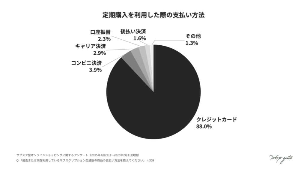 定期購入における支払い方法を調査した結果、クレジットカード決済が全体の約88%を占め、圧倒的に主流となっていることが明らかになりました。これは、一般的なEC取引においてもクレジットカード決済が主要な決済手段であることに加え、定期的に自動で決済が行われる定期購入の特性と、都度決済手続きが不要な利便性の高さが親和性を持つためと考えられます。複数の定期購入を契約しているユーザーにとっても、クレジットカードであれば決済や金額の確認を一元的に行えるメリットがあります。
