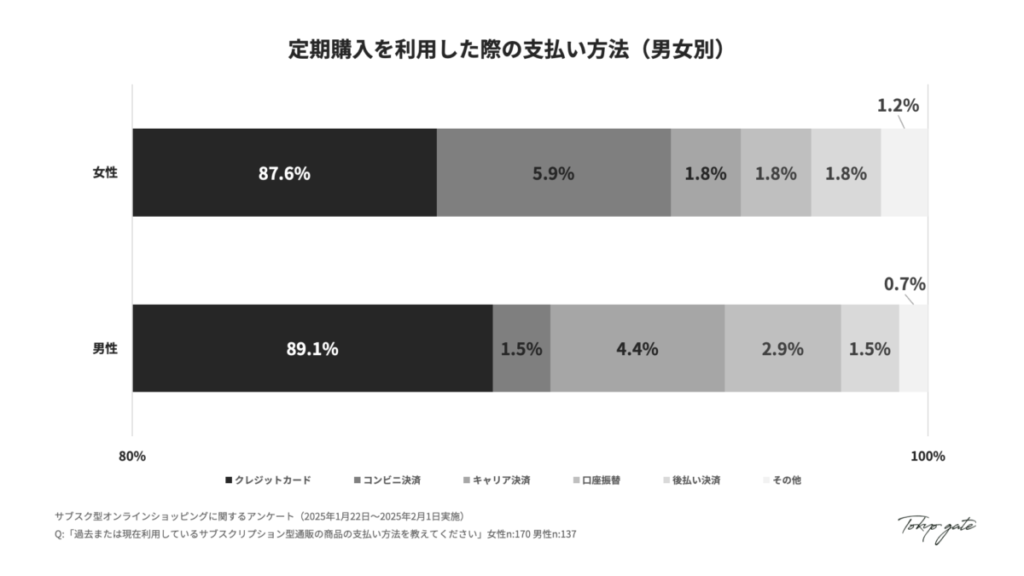 定期購入における支払い方法について男女別に集計したデータを見ると、クレジットカード以外の決済手段について僅かに男女差が見られます。コンビニ決済の利用割合は女性が約6%であるのに対し、男性は約1.5%と、女性のほうがコンビニ決済を定期購入の支払い方法として選択する傾向が顕著です。これは、一部の女性の間では、外出のついでに利用できるコンビニ決済は、クレジットカード情報の入力よりも手軽に感じられるため、利用頻度が高まると考えられます。