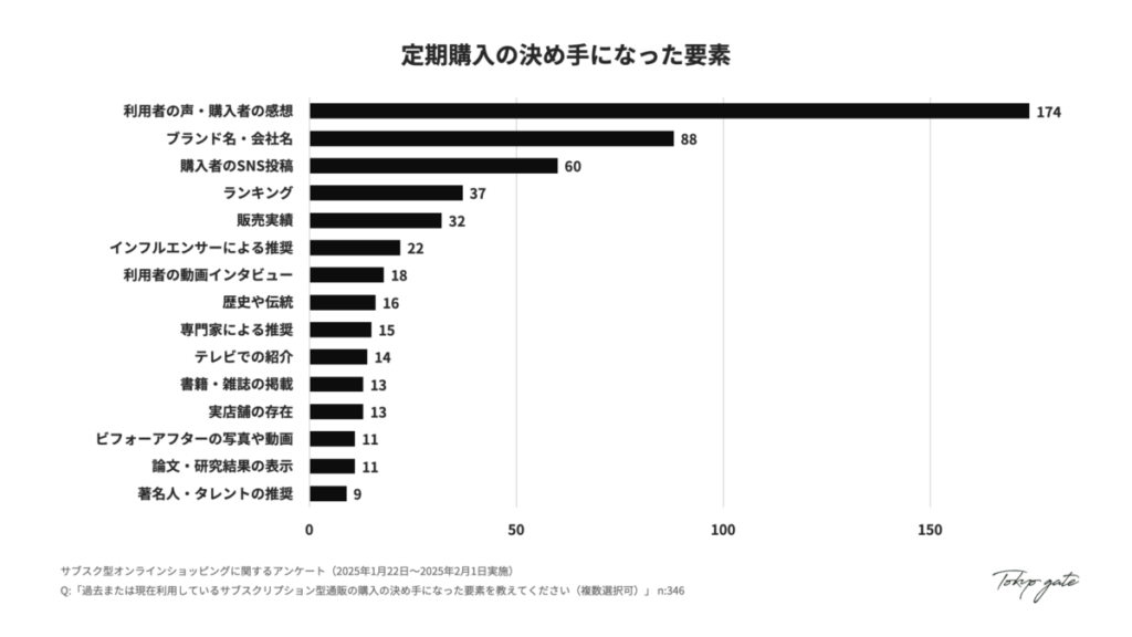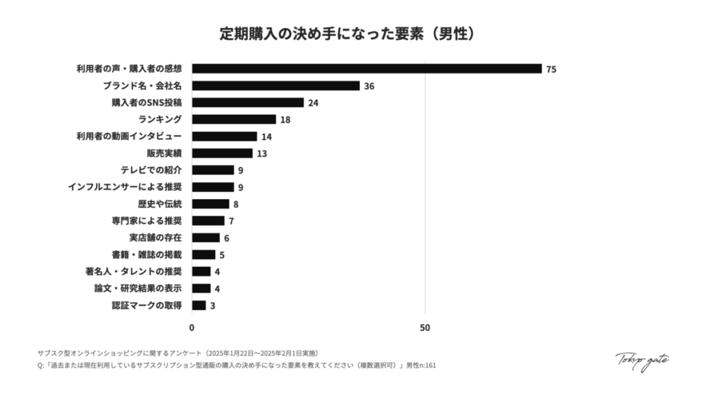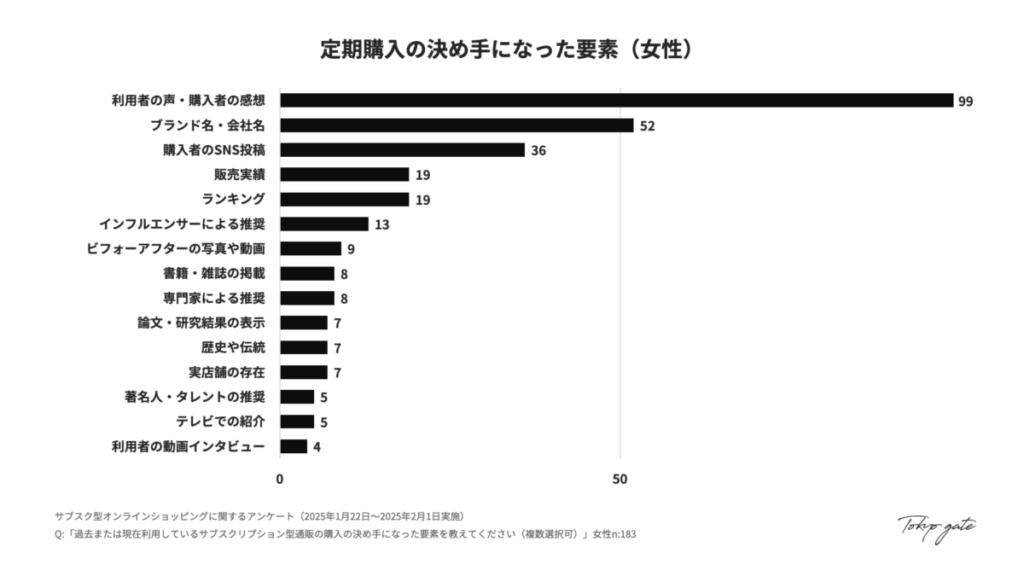 女性が定期購入の決め手とした要素について調査した結果を見ると、利用者の声・購入者の感想が約54%と、男性よりも8ポイント高い割合を示しています。このような結果から、女性ユーザーに対して定期購入を促進するため、既存顧客によるレビューやSNS投稿を積極的に収集し、新規顧客に対してわかりやすく提示する仕組みを構築することが重要です。例えば、定期購入のランディングページや商品ページにおいて、実際の購入者であることがわかる認証マークの付与や、具体的な使用感、ライフスタイルへの適合性などを詳細に記述したレビューを優先的に表示する設計が考えられます。