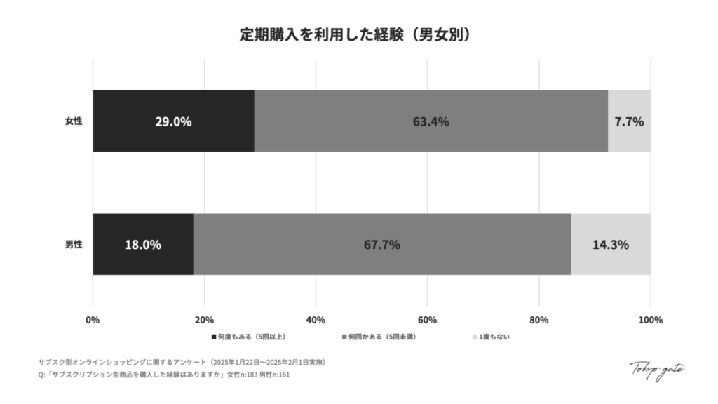 - 定期購入を何度も利用している女性ユーザーの割合は約30%で、男性に比べ10ポイント以上高いです。