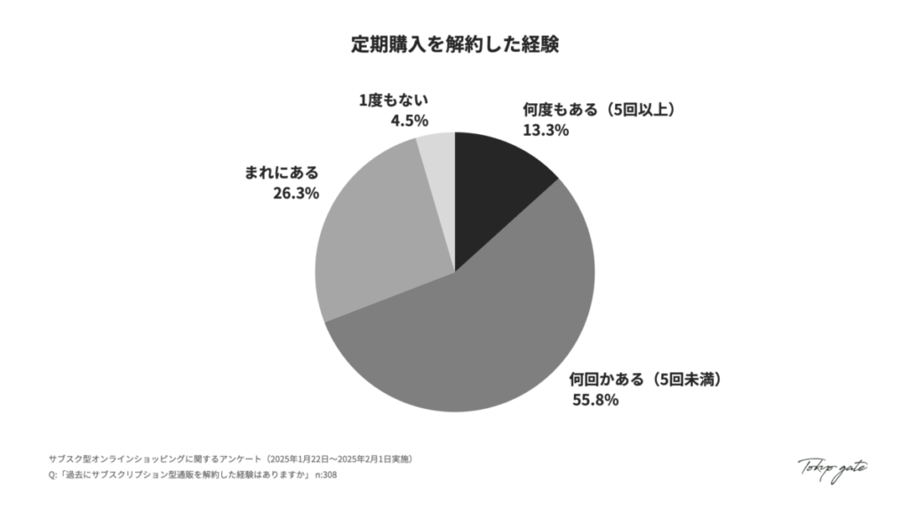 定期購入サービスの解約経験について調査した結果、約95%という非常に高い割合のユーザーが過去に定期購入を解約した経験があります。さらに「何度もある」と回答したユーザーも約13%存在することから、多くのユーザーにとって定期購入の契約と解約は繰り返される購買行動の一部となっていると考えられます。ユーザーは定期購入を「継続を前提とした契約」ではなく、「必要なときに利用できる選択肢」として認識している可能性が高く、長期的な利用を見込んだ獲得手法は、現代のユーザーニーズに対応することが難しい可能性があります。