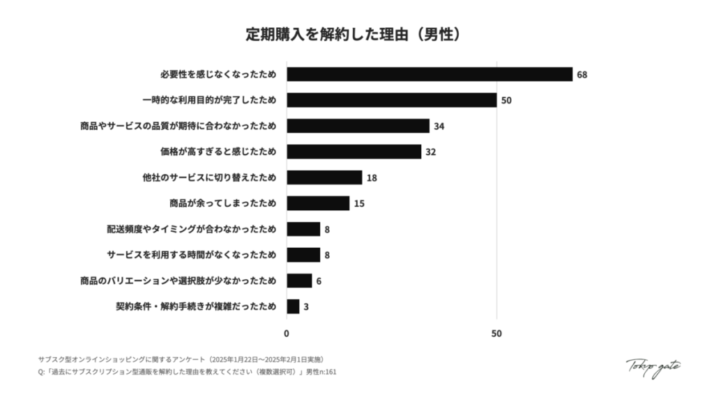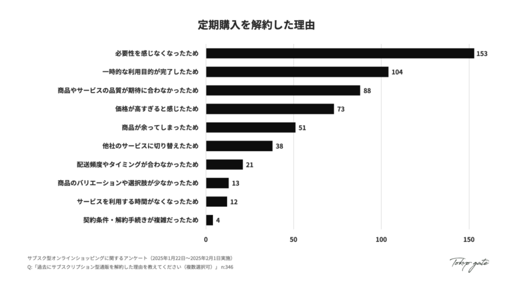 多くのECユーザーが、必要性の喪失や、一時的な利用目的の完了により定期購入を解約しており、定期購入が必ずしも継続を前提とした利用ではなく、必要に応じて柔軟に活用する選択肢として捉えられている現状が明らかになりました。