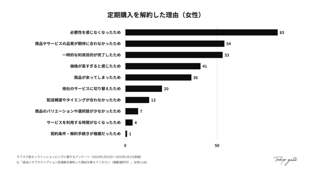- 定期購入を解約する理由は「必要性を感じなくなったため」「一時的な利用目的が完了したため」など、EC事業者によるコントロールが難しい領域と、ある程度改善が見込める領域に分かれます。