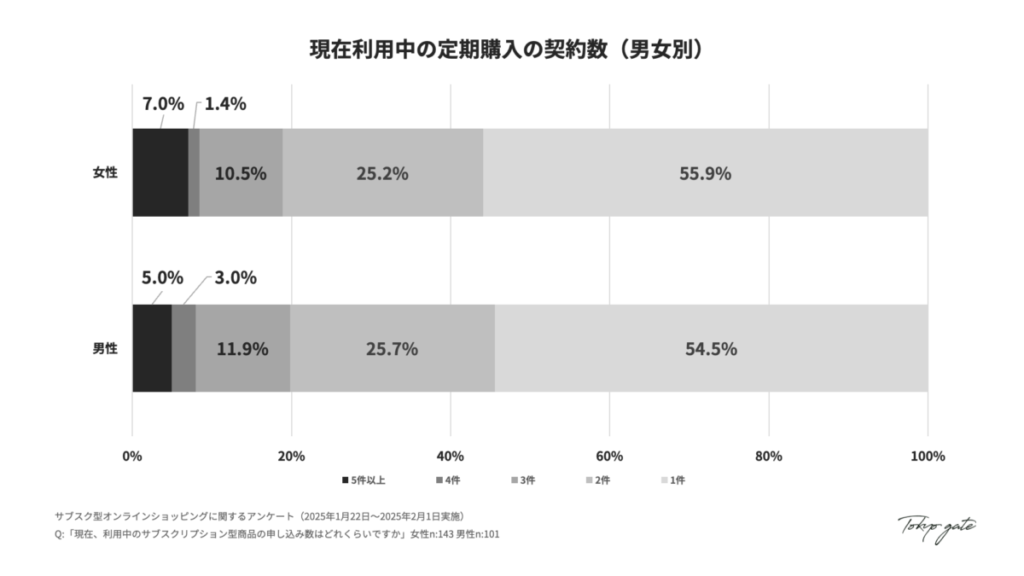 - 80%以上のユーザーが、1件または2件の定期購入を現在利用しており、約6%のユーザーは5件以上の定期購入を利用しています。