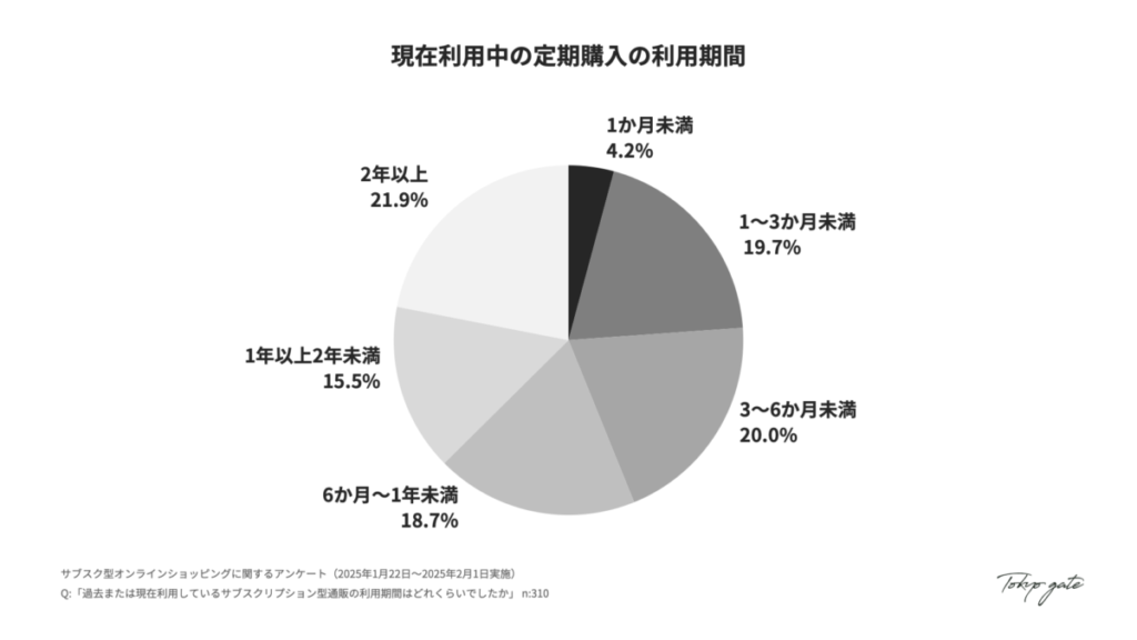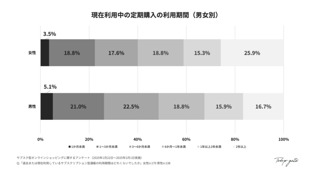 定期購入の継続期間について調査した結果、1か月から2年以上といった各継続期間において、それぞれ約20%前後のユーザーが分布しており、明確な偏りは見られませんでした。しかし、1年未満の利用者が約60%を占め、半数以上のユーザーが1年で離脱するという水準が確認できます。最初の1年を継続したユーザーは、商品のメリットや効果、満足度が高まった状態がすでに維持されている場合、離脱率の低下とその後の長期利用につながる可能性を示唆しています。