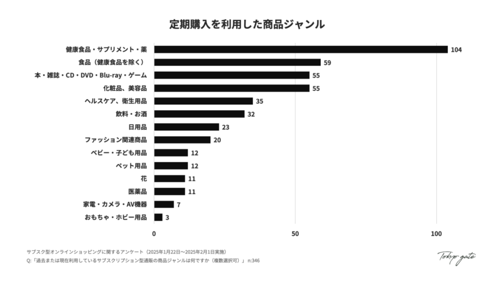 定期購入が利用される商品ジャンルについて調査した結果、健康食品・サプリメントが全体の約30%で最も高い割合を占めています。健康食品やサプリメントは、一定のペースで長期間継続して摂取することで効果が期待されるものが多く、自動的に商品が届く定期購入モデルと非常に相性が良いと言えます。