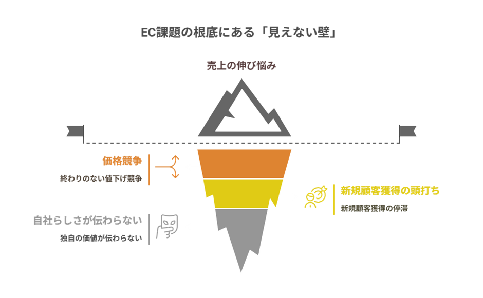そして三つ目が、「自社らしさが伝わらない」というもどかしさです。作り手のこだわりや商品の背景にあるストーリーこそが、あなたのECサイトの「らしさ」のはず。しかし、Web上ではスペック情報が中心となり、独自の価値が伝わりません。その結果、数多あるECサイトの中に埋もれ、「どこにでもあるお店」の一つとして認識されてしまいます。